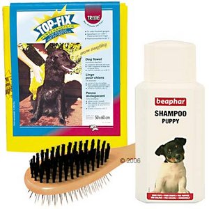 Alles, was Sie für die Fellpflege Ihres kleinen Rackers benötigen: Welpenshampoo, Hundehandtuch und Hundebürste